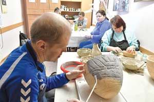 Kretingos dienos veiklos centre antrus metus veikia socialinės dirbtuvės, kurias lanko 15 asmenų su negalia, dauguma – iš Kretingos miesto socialinių įstaigų: Padvarių socialinės globos namų, Grupinio gyvenimo namų, taip pat ir Dienos veiklos centro lankytojai ar pavieniai kretingiškiai. Socialinių dirbtuvių siekis – formuoti žmonių su negalia darbinius įgūdžius ir integruoti juos į darbo rinką. Nuo rankdarbių – iki ūkio darbų Šiuo metu socialines dirbtuves, veikiančias dviejose Dienos veiklos centro patalpose, lanko 15 kretingiškių. Peržiem jie užsiima rankdarbiais ir keramika: lipdo, šlifuoja, dekoruoja įvarius gaminius iš molio – vazas, vazonus, taupykles, skulptūrėles ir kt. Šiems užsiėmimams vadovauja užimtumo specialistė Asta Venckienė, talkinant individualios priežiūros darbuotojai Laimai Stonkuvienei. „Kiekvieno jų gebėjimai – labai skirtingi, reikia pamatyti ir skatinti kiekvieną tai veiklai, kuri jiems labiausiai tinka. Žiemą mūsų lankytojai labiau suvaržyti – dirbtuvėse triūsia prie keramikos gaminių, bet ir šioje, atrodytų, vienodoje veikloje galima įžvelgti, kuris gabesnis kruopščiam rankų darbui – gaminti smulkias detales, dekoruoti, kuriam labiau tinka molį minkyti, šlifuoti ar dažyti. Jie gali dirbti laisvai ir nevaržomai, pagal savo fantaziją ir pagal tos dienos nuotaiką. Šiems žmonėms labai svarbu yra užimtumas, įdomi veikla, o ir paskatinimas“, – kalbėjo A. Venckienė. Jos žodžiais, socialinių dirbtuvių projektas yra vykdomas iš Socialinės apsaugos ir darbo ministerijos lėšų: jeigu žmogus mėnesį nepertraukiamai lanko socialines dirbtuves, jam yra mokama 50 Eur stipendija. „Atrodytų, tai nėra daug, tačiau šie pinigai yra paskatinimas žmogui. Juk pačiam nereikia mokėti nei už medžiagas ar įrangą, nei už mokymą“, – sakė užimtumo specialistė.