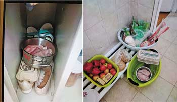 Darbuotojos buvo pasidėjusios atvėsintos vištienos krūtinėlės, maltos vištienos pusgaminių, sviesto, vaisių, daržovių, kiaušinių, batoną, net pjaustyto meliono ir cinamono. Sandėlininkės kambaryje papildomai aptikta šaldytos vištienos filė ir neaiškios kilmės mėsos gabaliukų – viskas laikyta kartu su asmeniniais daiktais. Be to, nustatyta, kad virtuvėje pagaminta daugiau maisto negu buvo valgančiųjų – išdalinus pietus, liko 14,5 kg įvairių patiekalų: bulvių košės, lęšių sriubos ir daržovių. Paskutinei vaikų grupei neužteko grietinės ir sviesto padažo – buvo tik 40 g vietoj reikiamų 140 g. VMVT specialistai užfiksavo ir maisto laikymo pažeidimų: sandėlyje varškė laikyta per 21 laipsnį šilumos, o sandėlyje jogurtai – per 18,3 laipsnių temperatūroje, nors šie produktai privalo būti laikomi šaldytuve.