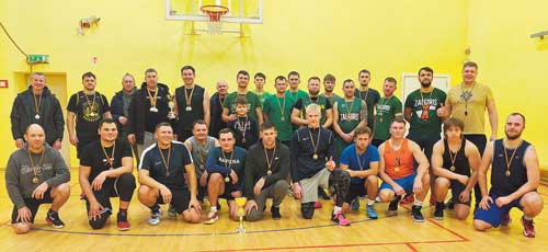 Krepšinio turnyro „Kartų mūšis“ dalyviai, susirinkę pabūti kartu krepšinio aikštėje, su turnyro iniciatoriumi Arimantu Mikaločiumi (pirmas iš dešinės).