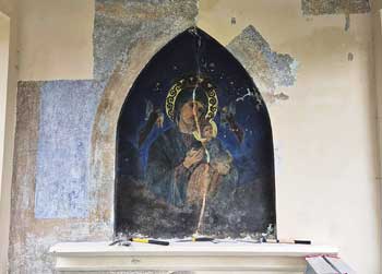 Mergelės Marijos freska yra nuolat veikiama kintančių oro sąlygų, po ja ant betoninės lentynėlės buvo dedamos gėlės, įvairios dekoracijos ir devocionalijos, degė žvakės, kurių liepsnos ir suodžiai sunaikino apatinę piešinio dalį, tad vėliau piešinys kelis kartus buvo perdažytas: jį savanoriškai restauravo kretingiškiai savamoksliai dailininkai. Jurgio Ambraziejaus Pabrėžos antkapinės koplyčios freska buvo kosmetiškai restauruota 2004 ir 2013 m., o 2025 m. lapkričio pabaigoje užbaigta jos profesionali restauracija, kurios metu freskai sugrąžintas pradinis – tarpukario laikotarpio – grožis: atkurti autentiški spalviniai sprendimai, užrašas ir augalinis ornamentas. Ilgą laiką buvo manoma, kad freskos dailininkas taip ir liks nežinomas, tačiau įvyko stebuklas. Tyrinėdama Kretingos muziejaus mokslinio archyvo bylas atradau muziejininko Juozo Mickevičius įrašą, kad „Zacharka Benediktas, sūnus Antano nupiešė viduje ant sienos Mariją su kūdikėliu, nudažė koplytėlę, o vėliau, apie 1955 m. atnaujino, nudažė sienas“, o jo brolis Pranas sukūrė koplyčios skulptūras. Kadangi koplytėlės atvaizdas sutvisko savo pradiniu grožiu, verta prisiminti ir susipažinti su šio kūrinio autoriais ir jų gyvenimų istorijomis. Tikras stebuklas, kad Zacharkų giminės atstovai vis dar gyvena Kretingoje! Už ilgus pokalbius esu dėkinga Zacharkų marčiai Janinai Vandai, palikuonims Živilei ir Emilijui. Seniausius Zacharkų giminės protėvius pavyko atrasti Panemunyje, Rokiškio rajone: Pranciškus ir Anelė Leikutė (1838–1908) Zacharkos susilaukė dviejų sūnų – Antano (1874–1918) ir Motiejaus (1876–?), kurie, ieškodami geresnio gyvenimo, patraukė į Rygą. Kol kas nepavyko sužinoti, kuo jie užsiėmė, tačiau fiksuojamas faktas, kad 1904 m. Rygoje Antanas Zacharka susituokė su Brigita Žiogaite (1881–1955), ten pat šeima susilaukė aštuonių vaikų: Pranciškaus (1904–1979), Juozapo (1906–1906), Benedikto (1907–1960), Juozapotos (1909–1909), Onos (Ancės) Serafinavičienės (1910–1988), Jono (1912–1977), Stepono (1915–1922), Stasio (1917–1988).