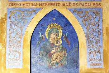 Kretingos parapijos senosiose kapinėse iš tolo akį traukia pranciškono Jurgio Ambraziejaus Pabrėžos antkapinė koplyčia, kurios pietvakarinėje sienoje, smailiaarkėje nišoje ant sienos nutapyta freska „Švč. M. Marija Nuolatinė Gelbėtoja“, vaizduojanti Dievo Motiną su vaikeliu Jėzumi ant rankų; iš abiejų pusių pavaizduoti Arkangelai, laikantys Kristaus kančios įrankius. Viršuje užrašytas atvaizdo titulas „Dievo Motina Neperstojančios pagalbos“. 1936 m. Kretingos parapijos leidinyje ne tik freska, bet visa koplytėlė pavadinta „Neperstojančios pagelbos“. Šis atvaizdas išreiškia dvi esmines teologines tiesas: Marija – motina ir užtarėja žmogaus varguose ir kančiose; Kristus – Išganymo šaltinis, į kurį Marija rodo tikintiesiems ir prie kurio veda savo globėjiška ranka. Įdomi šio atvaizdo istorija – tai yra Romos Šv. Afonso Liguori bažnyčioje esančios XV a. ikonos kopija. Iš pirmo žvilgsnio sakytume, kad tai autentiška stačiatikių ikona. Tačiau būtent šis ikonografinis tipas gimė ne Bizantijoje, o Vakarų Bažnyčioje. Gali būti, kad tam įtakos turėjo 1423 m. įsteigta „Dievo Motinos Sopulingosios“ minėjimo diena. 1876 m. popiežius Pijus IX liturgine švente oficialiai paskelbė Švč. Mergelės Marijos Nepaliaujamos Pagalbos (angl. Our Lady of Perpetual Help) šventę birželio 27 d. Matome, kad šiame atvaizde Marija ir vaikelis Jėzus papuošti brangakmeniais nusagstytomis karūnomis. Bizantinė tradicija apskritai nekarūnuoja ikonų, o karališkumą perteikia aureole ir spalvomis. Katalikiškame pasaulyje pirmasis Nepaliaujamos Pagalbos Motinos atvaizdo karūnavimas įvyko 1867 m., kai popiežius Pijus IX įsakė iškilmingai karūnuoti šią ikoną Romoje, Šv. Alfonso Liguori bažnyčioje. Senieji kretingiškiai papasakojo, kad koplytėlės sienoje t. Augustinas Dirvelė įstatęs paties J. Pabrėžos tapytą paveikslą. Keistai skamba tas kretingiškių pasakojimas – juk Mergelės Marijos freska yra tapyta ant sienos – jos neįmanoma atsinešti ir įstatyti. Tačiau žinant, kad 1932 m. birželio 12 d. Augustinas Dirvelė pašventino dar nepabaigtą koplytėlę, kyla mintis, kad ir freska tuomet dar nebuvo nutapyta. Gali būti, kad tuščia anga buvo uždengta J. Pabrėžos tapyta bažnytine vėliava, kuri tuo metu buvo saugoma pranciškonų vienuolyne.