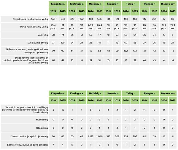 Šalies policijos komisariatai visuomenei pristatė savo praėjusių metų veiklos rezultatus. „Vakarų Lietuva“ apžvelgė, kaip keitėsi kriminogeninė situacija per pastaruosius metus Klaipėdos, Kretingos, Mažeikių, Skuodo, Telšių, Plungės rajonuose ir Rietavo savivaldybėje. Bendra situacija šalyje Policijos pareigūno profesija – ypatinga, reikalaujanti ir drąsos, ir pasirengimo. Lietuvos policijos šūkis „Ginti, saugoti, padėti“ akcentuoja ir policijos misiją užtikrinti visuomenėje rimtį ir tvarką. Tačiau bėgant metams žmonių, kurie ryžtasi dirbti šį darbą, mažėja, dėl to Lietuvos policija kaip vieną pagrindinių nūdienos iššūkių įvardina pareigūnų stygių visuose šalies komisariatuose. Apklausos rodo, kad 89 proc. žmonių jaučiasi saugiai savo gyvenamojoje vietovėje, ir tai yra vienas geriausių rodiklių Europos Sąjungoje. Lietuvos policijos generalinis komisaras Arūnas Paulauskas juokaudamas sakė, kad kiekvienas galim tuo įsitikinti atlikę vadinamąjį žoliapjovės testą – visai dienai palikti žoliapjovę nerakinamame kieme. Tikimybė grįžus vakare po darbo ją rasti toje pačioje vietoje yra gerokai didesnė negu prieš 10–15 metų. Bet komisaras nevadina to policijos nuopelnu. Pasak jo, tai kompleksinių sprendimų, augančio pragyvenimo lygio, visuomenės sąmoningėjimo rezultatas.