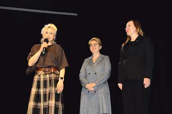 Tarptautinės teatro dienos proga svečius ir saviškius pasveikino (iš kairės) Kretingos dienos veiklos centro vyriausioji socialinė darbuotoja Laura Keblienė, Savivaldybės socialinės paramos skyriaus vedėjos pavaduotoja Margarita Lipskienė ir Asmenų su negalia reikalų koordinatorė Lina Kručiuvienė.