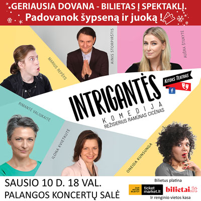 „Kitoks teatras“ pristato komediją „Intrigantės“, kurioje vaidina visiems puikiai pažįstamos teatro, kino ir televizijos žvaigždės: Rimantė Valiukaitė / Ilona Kvietkutė, Oneida Kunsunga, Edita Užaitė / Aušra Štukytė bei Marius Repšys / Ainius Storpirštis.