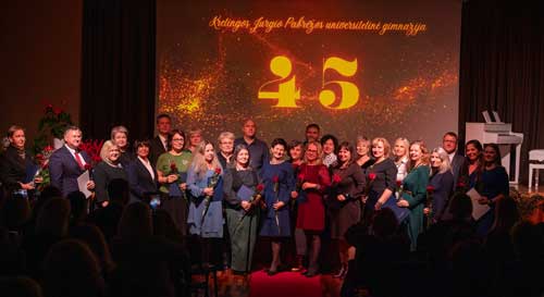 Kretingos Jurgio Pabrėžos universitetinė gimnazija lapkričio 19 d. paminėjo išskirtinę sukaktį – 45-ąjį jubiliejų. Į šventę „Laiko takais“ susirinko gausus būrys svečių: mokytojai, mokiniai, alumnai, socialiniai partneriai, taip pat tie, kuriems ši mokykla yra tapusi antraisiais namais. Svečius pasitiko Klaipėdos Eduardo Balsio menų gimnazijos styginių instrumentų orkestras. Šventės pradžioje renginio vedėjas, Kauno dramos teatro aktorius Egidijus Stancikas akcentavo, kad 45 metai – tai ne tik solidi istorija, sukaupta patirtis ir brandos laikas, bet ir jaunatviškas veržlumas, kūryba bei nuolatinė raida. Šventė prasidėjo Kretingos rajono vicemerės Vaidos Jakumienės, Savivaldybės administracijos direktorės pavaduotojos Vaidos Bačiulienės, Švietimo skyriaus vedėjos Astos Burbienės ir Seimo narės Violetos Turauskaitės patarėjos Jolantos Gedvilaitės sveikinimais. Gimnazijos bendruomenę taip pat pasveikino gimnazijos tarybos pirmininkė Gražina Banienė ir gimnazijos Mokinių parlamento prezidentė Liucija Gaudutė. Renginį papuošė ir muzikiniai pasirodymai – skambėjo profesionalių solistų Ritos Preikšaitės, Mindaugo Jankausko, Edgaro Pylipaičio balsai. Jų atliekamos dainos lydėjo susirinkusiuosius gimnazijos istorijos keliais, kurie prasidėjo nuo mažos idėjos, mokytojų tikėjimo ir mokinių svajonių. Per 45-erius metus Kretingos Jurgio Pabrėžos universitetinė gimnazija išaugino mokslininkus, gydytojus, kūrėjus, mokytojus, visuomenės veikėjus ir daugybę tėvų, kurių vaikai šiandien eina tais pačiais mokyklos koridoriais. Ypatingas vakaro momentas – padėkos įteiktos mokytojams, kurie ilgus metus kūrė gimnazijos istoriją. Vadovaujantis mero potvarkiu, mokytojams buvo skirta ir įteikta 21 padėka už atsidavimą, kantrybę ir nuolatinį tikėjimą mokinių galimybėmis. Švietimo, mokslo ir sporto ministrės padėkos įteiktos vyresniajai fizikos mokytojai Virginijai Kuprienei – už profesorės Meilės Lukšienės idėjų puoselėjimą, gimnazijos direktoriui Kęstučiui Trakšeliui – už reikšmingus pedagoginius ir vadybinius pasiekimus. Direktorius padėkomis taip pat pagerbė ir ilgamečius nepedagoginius darbuotojus.